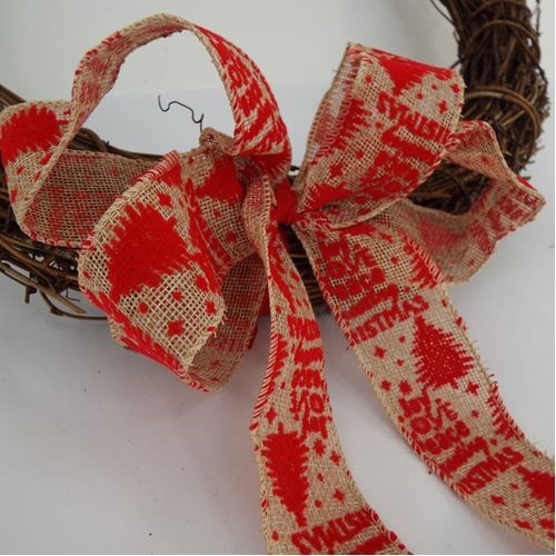 A beautiful white Jute ribbon with Christmas greeting in red along with red trees. This would look lovely on kraft paper or to adorn a hamper. (Wreath in picture is our Large Rustic Vine Wreath sku: 0992-53