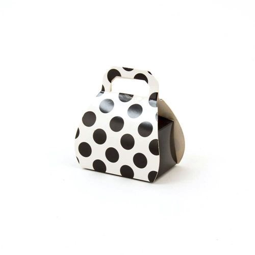 A very cute hand bag style favor box with a polka dot pattern. Dimensions 60mm Long 40mm Wide 75mm High x12 boxes per pack