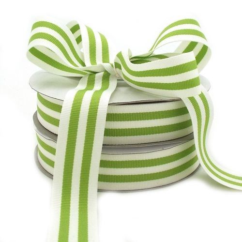Lovely striped ribbon in green and white. Perfect for craft projects, gift wrapping, accenting wedding designs, wrapping wedding bouquets, and so much more. 25mm x 25m