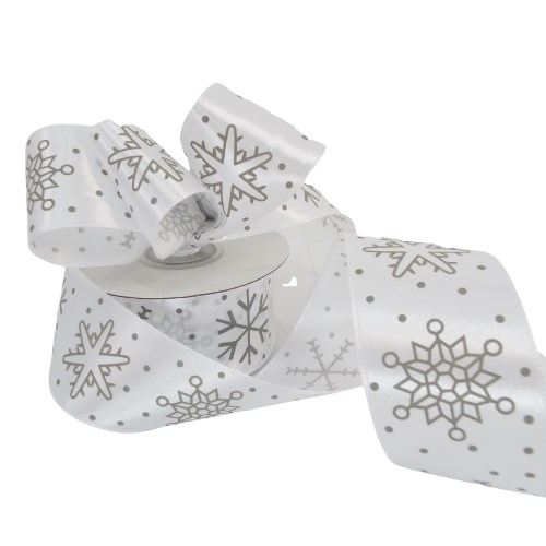 Silver Snowflake pattern on White Ribbon. A Christmas classic to add to your gifts or hampers. Dimensions: 38mm x 25m Roll