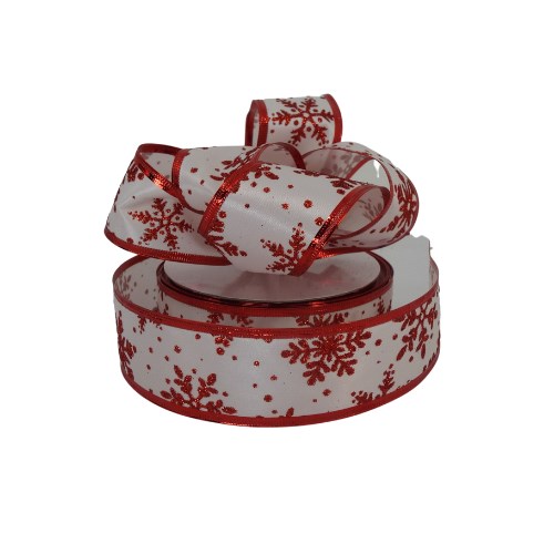 Sparkly Red Snowflake pattern on White Ribbon. A Christmas classic to add to your gifts or hampers. Dimensions: 38mm x 25m Roll