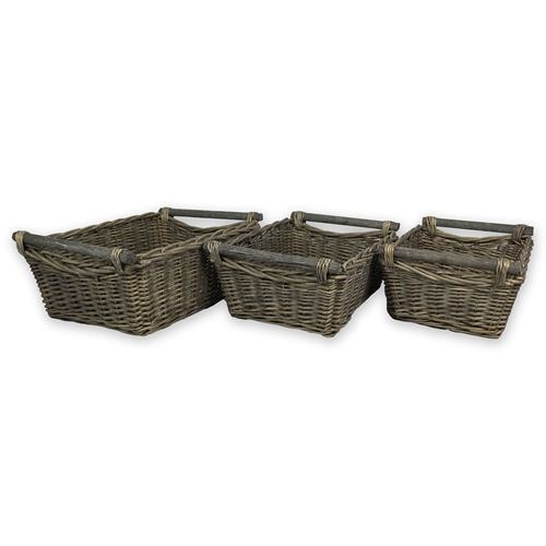 Lovely set of 3 rustic rattan baskets. So useful for storage in every room of the house, and perfect in any country cottage style room or even a modern room scheme, they are very versatile! Measurements are - 46x38, 43x34, 37x31cms.