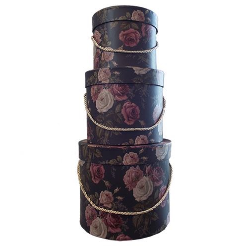 Gorgeous set of moody round floral boxes, great size to put bouquets in or use as a gif box,plenty of options with this set. Sizes Large - 22cmD x 19cmH Med - 19cmD x 17cmH Small - 16cmD x 14cmH